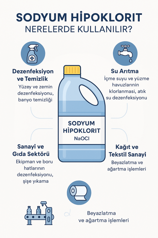 Sodyum hipoklorit, güçlü oksitleyici ve bakteri, mantar ve virüs öldürücü özellikleriyle hijyen ve temizlikte vazgeçilmez bir kimyasal maddedir. Özellikle su arıtma, yüzey dezenfeksiyonu ve gıda endüstrisi temizlik uygulamalarında yaygın olarak kullanılır.
